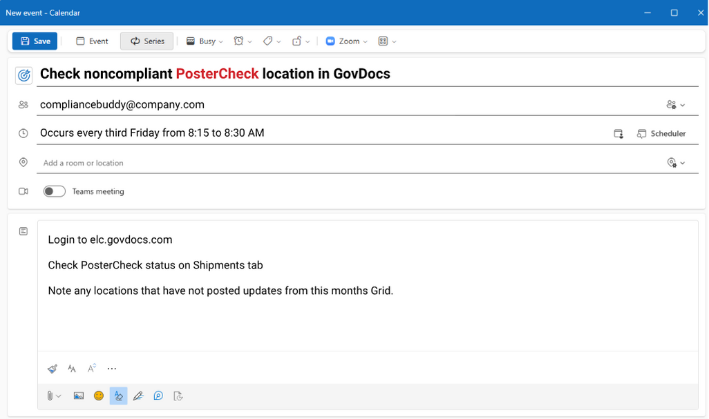 - Establish a monthly cadence. Designate a short recurring task (10–15 minutes) during the first week of each month to check PosterCheck status for all locations.